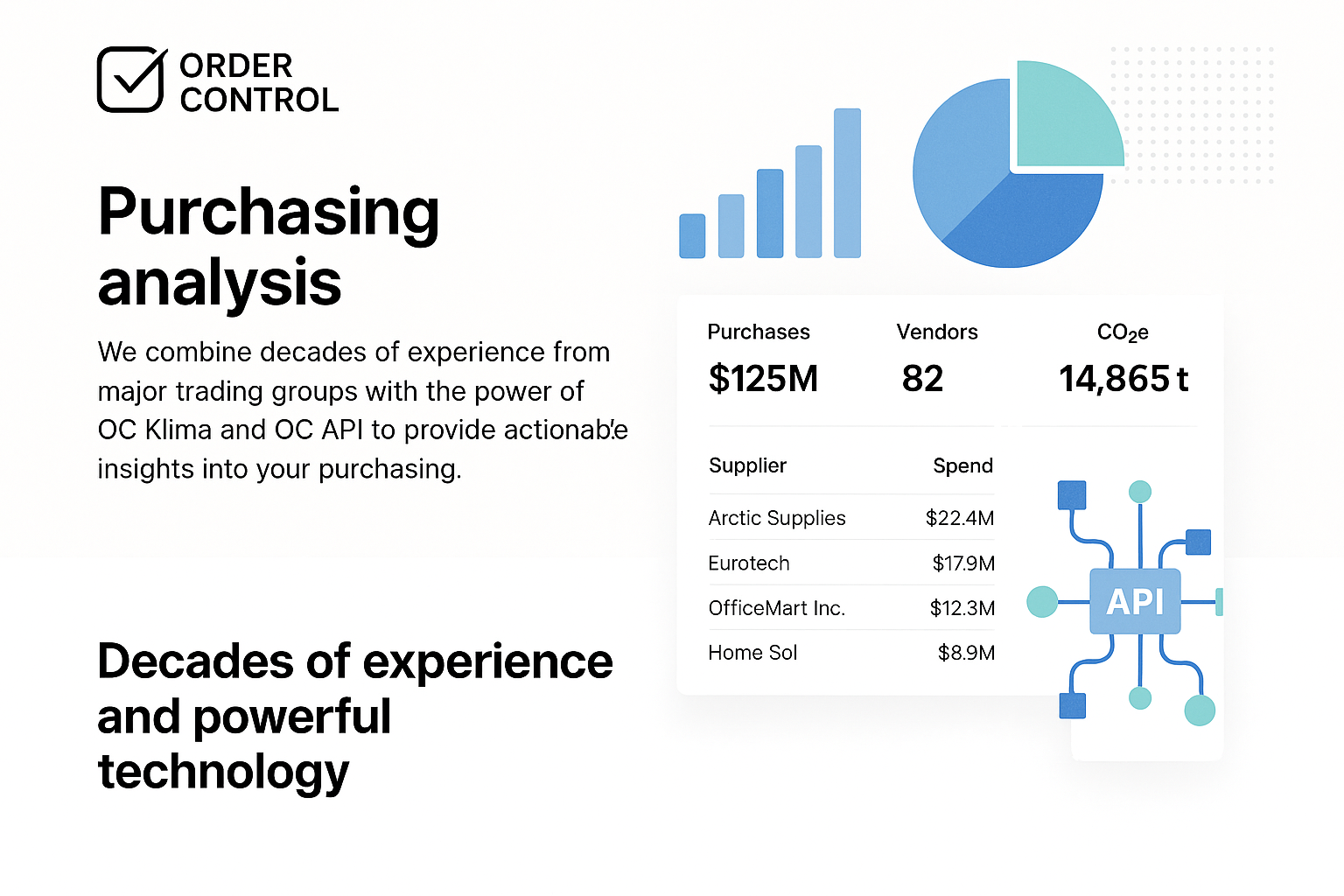 Order Control Innkjøpsanalyse kombinerer 30 års erfaring fra store handelskonsern med to tekniske motorer: OC Klima (klimadata på varenivå) og OC API (åpen, sikker datatilgang). Resultatet er en analysepakke som går dypere enn tradisjonell “spend”: vi kobler produkt‑, pris‑, og leverandørdata til faktiske varelinjer, og kan i tillegg legge på aktivitetsbaserte klimadata for å styre både kost og CO₂.