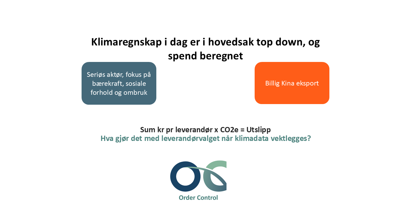Top down spend beregning gir feil styringsgrunnlag. Pris styrer utslipp. Det er problematisk at dette er den mest brukte metoden for beregning i dag. Order Control løser opp i dette automatisk.